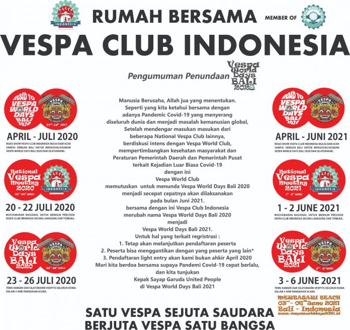 17 club vespa terbesar di indonesia Vwd 2020 ditunda hingga 3 sampai 6 juni 2021, karena corona